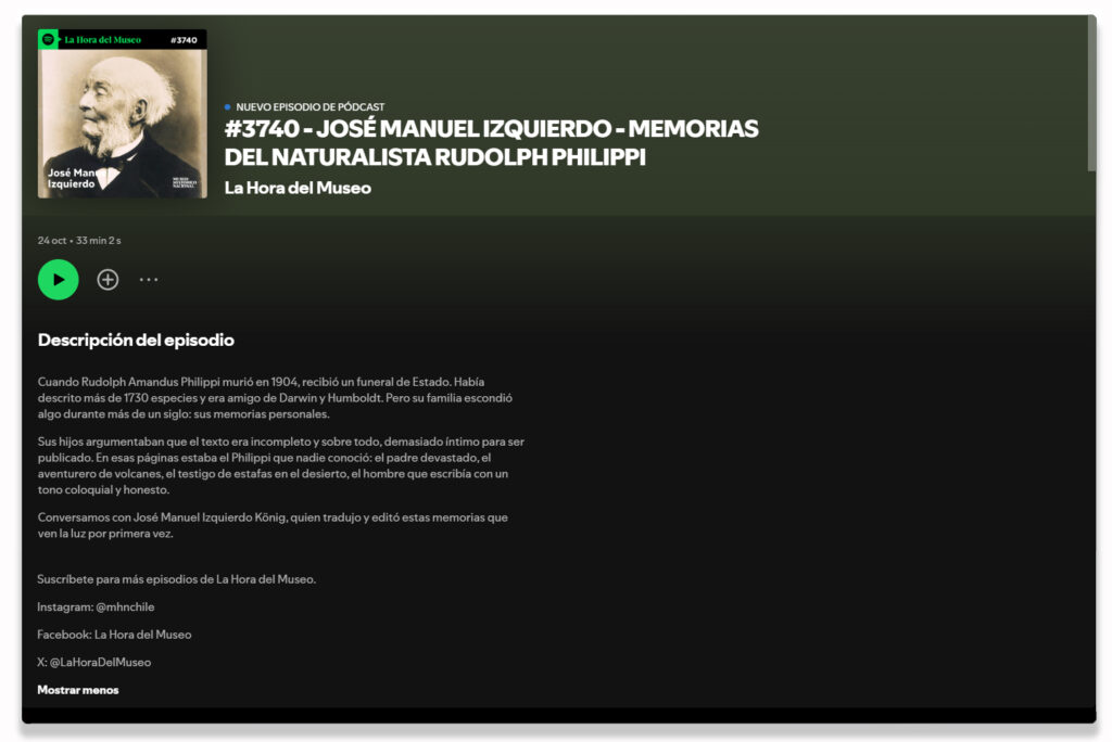 En Medios: “José Manuel Izquierdo-Memorias del Naturalista Rudolph Philippi”. La Hora del Museo Podcast de Spotify. 24-10-2025