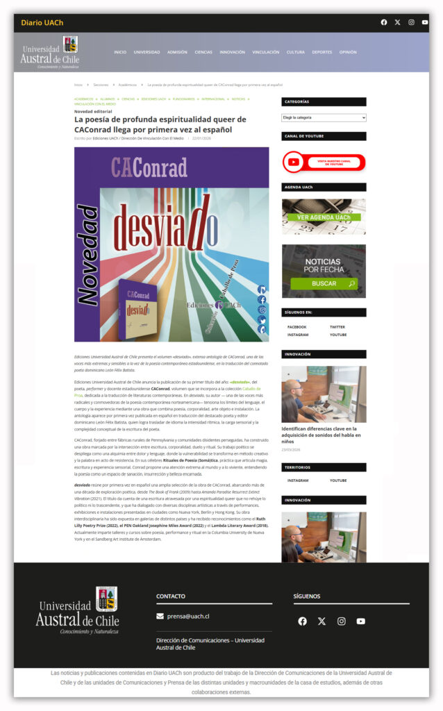 En Medios: “La poesía de profunda espiritualidad queer de CAConrad llega por primera vez al español”. Diario UACh. 22-01-2026