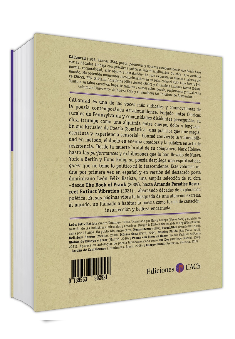 CAConrad es una de las voces más radicales y conmovedoras de la poesía contemporánea estadounidense. Forjado entre fábricas rurales de Pennsylvania y comunidades disidentes perseguidas, su obra irrumpe como una alquimia entre cuerpo, dolor y lenguaje. En sus Rituales de Poesía (Somá)tica –una práctica que une magia, escritura y experiencia sensorial– Conrad convierte la vulnerabilidad en método, el duelo en energía creadora y la palabra en acto de resistencia. Desde la muerte brutal de su compañero Mark Holmes hasta las performances y exhibiciones que lo han llevado de Nueva York a Berlín y Hong Kong, su poesía despliega una espiritualidad queer que no teme lo político ni lo trascendente. Este volumen reúne por primera vez en español y en versión del destacado poeta dominicano León Félix Batista, una amplia selección de su obra –desde The Book of Frank (2009), hasta Amanda Paradise Resurrect Extinct Vibration (2021)–, abarcando décadas de exploración poética. En sus páginas vibra la búsqueda de una atención extrema al mundo, un llamado a habitar la poesía como forma de sanación, insurrección y belleza encarnada.